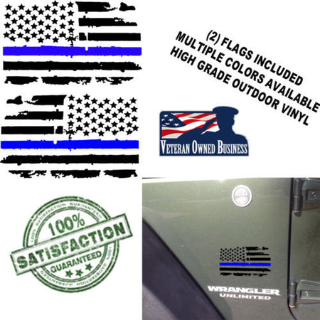 A pair of 12 inch Thin Blue Line Distressed USA Flag Vinyl Decals Police Officer jeep, Truck, Universal