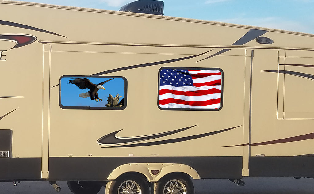Waving American Flag Universal RV Camper or 5th Wheel Window 50/50 Perforated Vinyl Decal